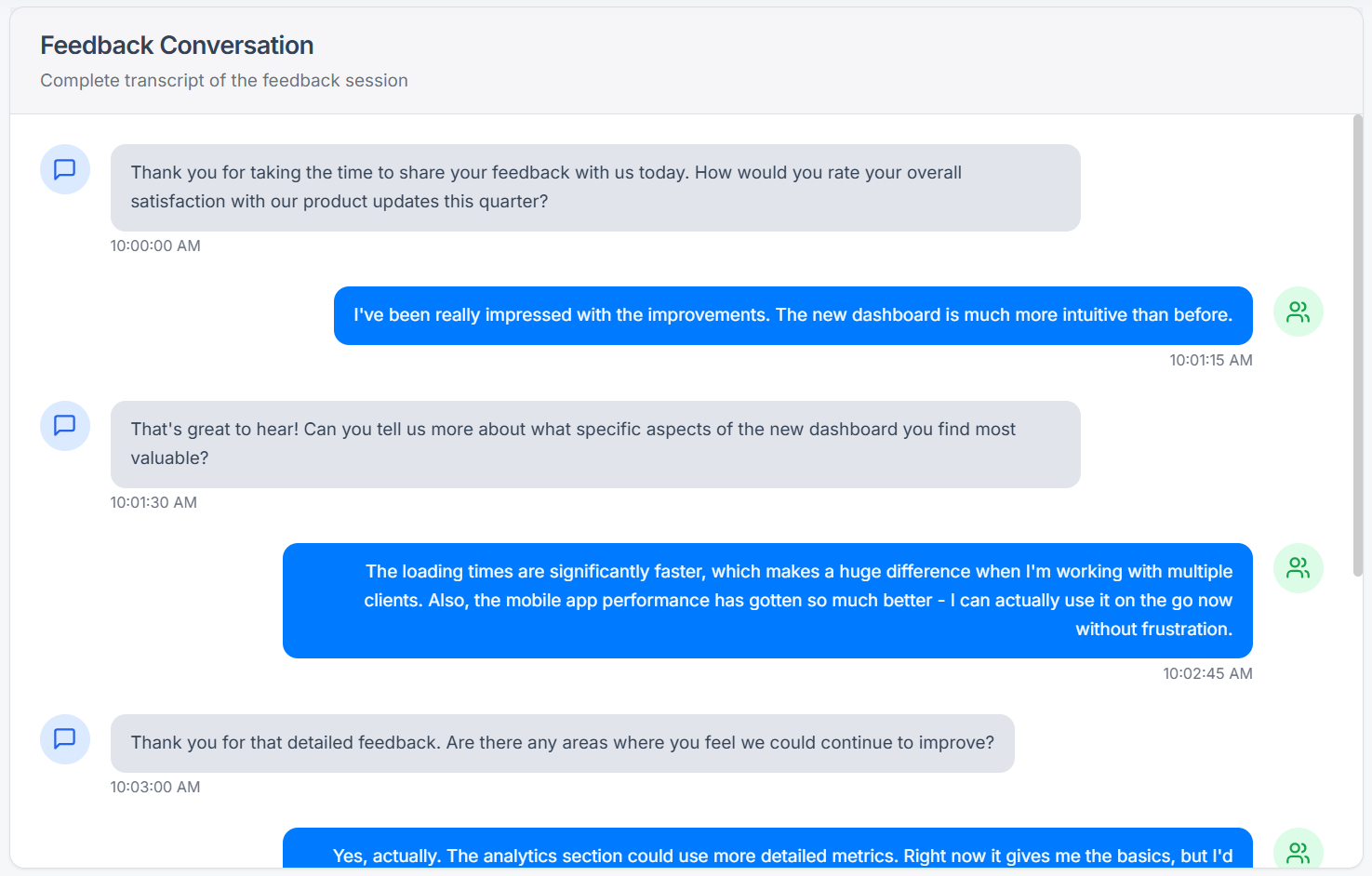 AI guides follow-up questions naturally during each feedback session, surfacing deeper proof and clearer validation without manual scripting.