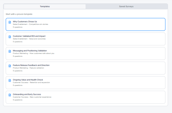 Increase win rates, accelerate momentum, and close deals faster by enabling your sales and GTM teams to capture targeted customer feedback and turn it into proof that drives revenue.