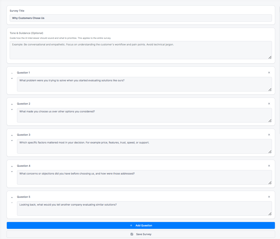 Set up targeted feedback flows for renewals, upsells, or competitive wins. Capture insights aligned to each stage of your sales motion without any code.